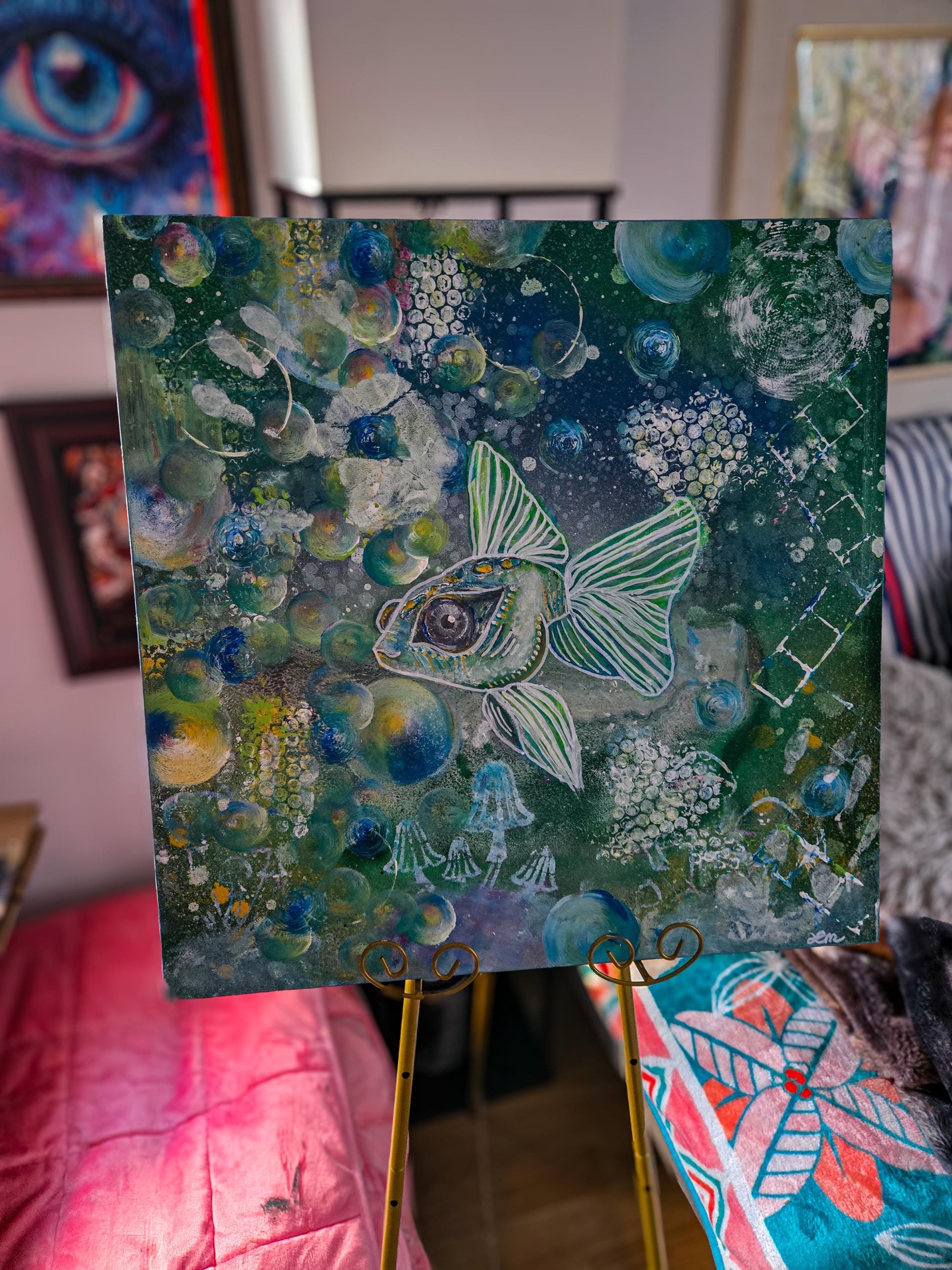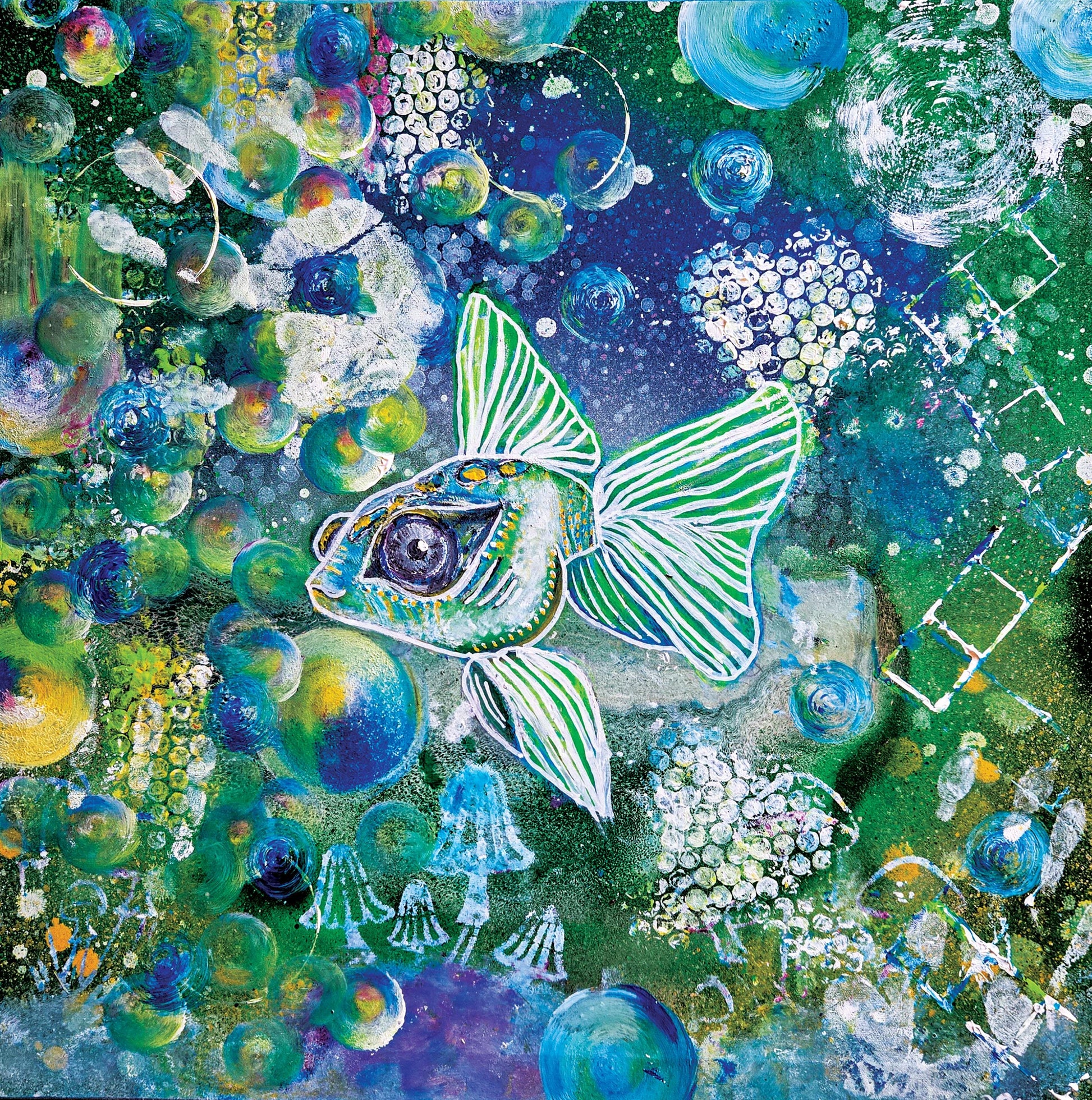 “Maisie’s Fish” is a dreamy mixed-media piece that dives into an underwater world full of whimsy, texture, and imagination. A luminous fish floats through a sea of bubbles, mushrooms, and intricate layered patterns — each detail revealing the playful curiosity of the deep. Soft greens, blues, and pearly highlights create a sense of movement and mystery, as though the viewer is peering into a living daydream.