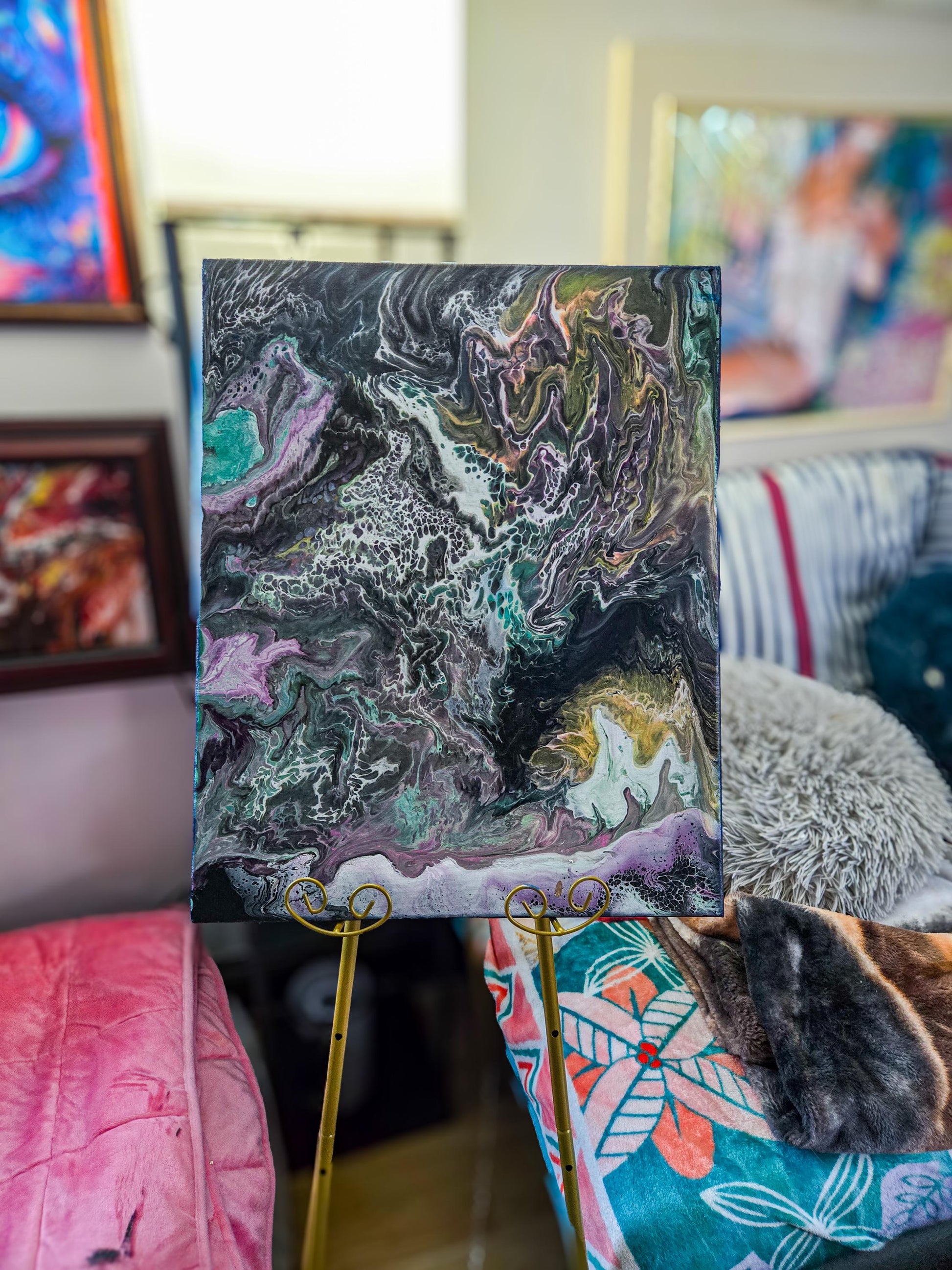 Original acrylic pour on 16" x 20" canvas—a captivating conversation piece that keeps its own secrets! 💜